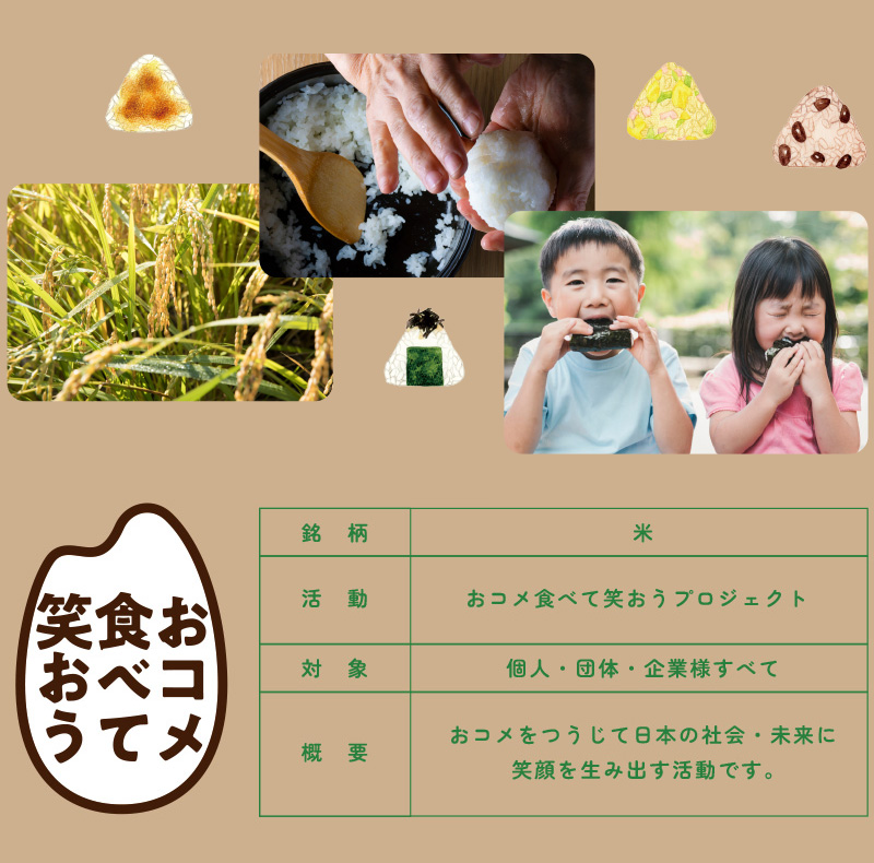 「おコメ食べて笑おう」プロジェクトは、「おコメ」をつうじて日本の未来を考えるプロジェクトです。