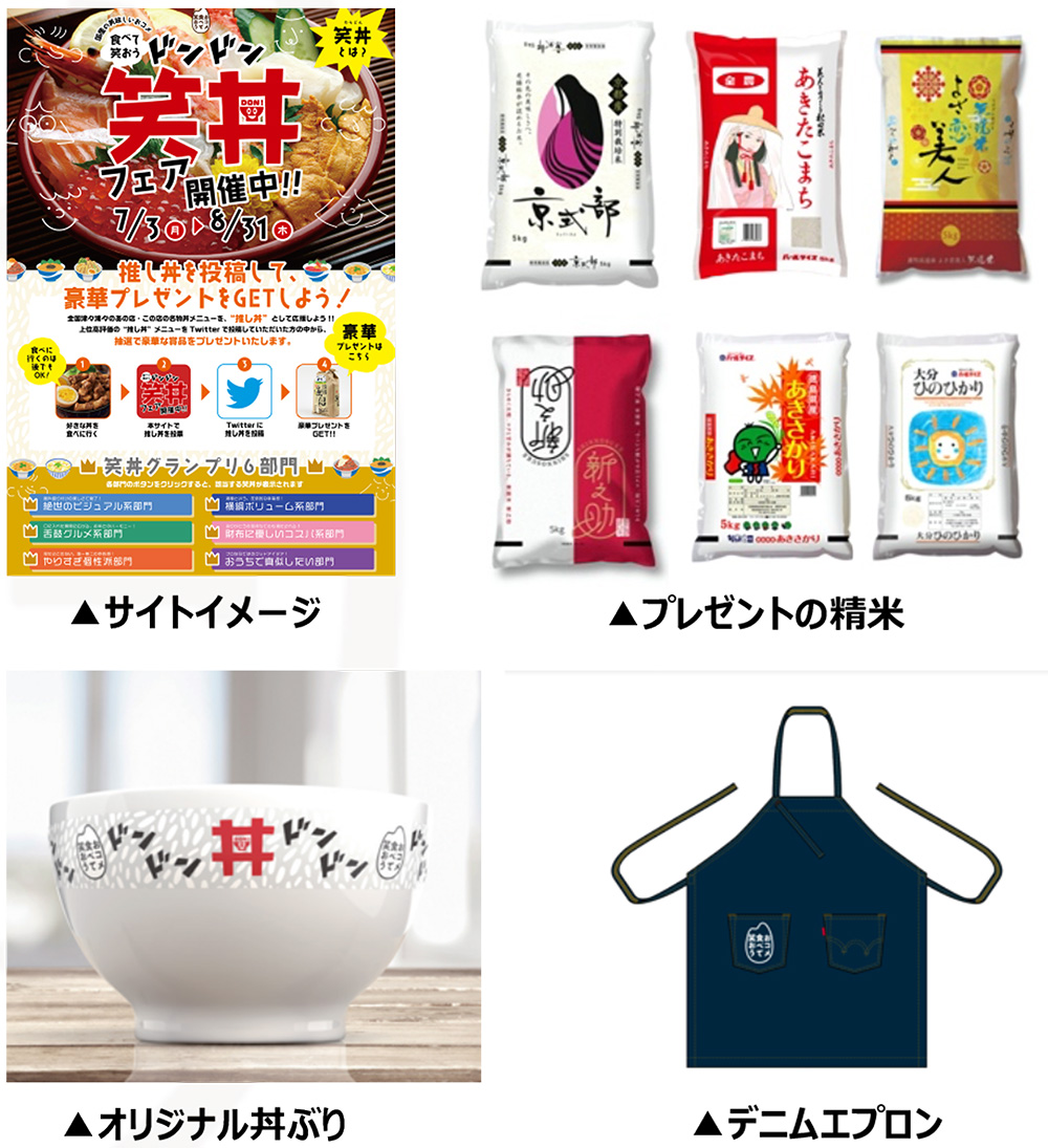 全国の飲食店からの事前エントリーにより集まった約600丼を特設サイトで公開し、フェア開催期間中にユーザーの「いいね」を最も多く集めた“推し丼”と、6つの部門賞に選ばれた丼の提供店を表彰します。また、本フェアで紹介している丼の中から上位高評価の“推し丼”を実際に食べてTwitterで投稿していただいた方の中から抽選で、お米やオリジナル丼ぶり(食器)、エドウインオリジナルのデニムエプロンをプレゼントします。